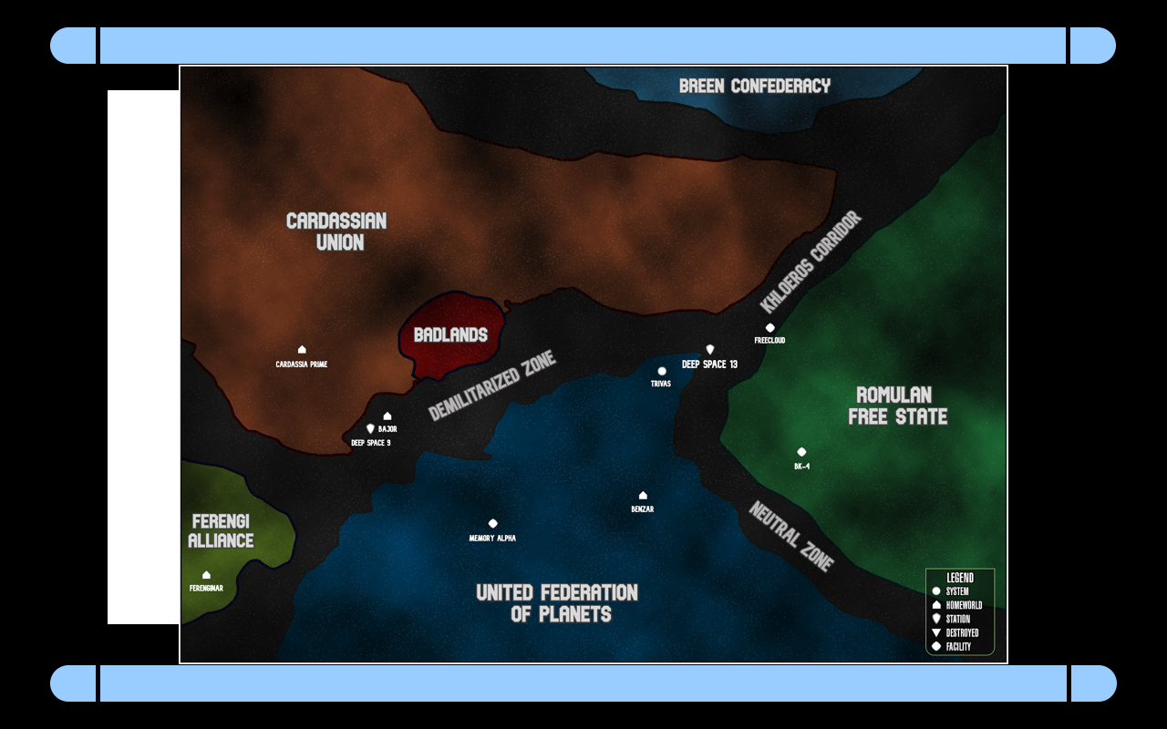 To add further complication to an already delicate and complicated situation, the Romulan's, with the Federation Council's permission, settled on Trivas 1 and 2, within Federation Space. This offers a lot of protection for these colonies, local to Deep Space 13, but for the others on the other side of the border, they are open to the dangers of a resurgent Cardassian Union.