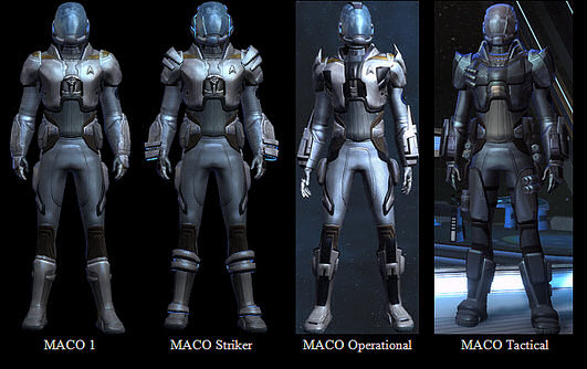 Beyond the standard issue EV suit, the USS Hera uses specialized armor suits designed by MACO teams and converted for Intel uses. These suits are designed using a saber ceramic compression system to create the plating and outer material while the inner suit contains biometric monitoring and maintenance hardware. Basic materials are a compressed duranium polyalloy weave which provides good protection from both physical and energy attacks. Suit is custom made to each person and is made of a full body undersuit and the overbody suit which seals over the undersuit. As the panels are a polyalloy weave, they act non-newtonian and are hard when struck, but are semi-flexible to the touch.